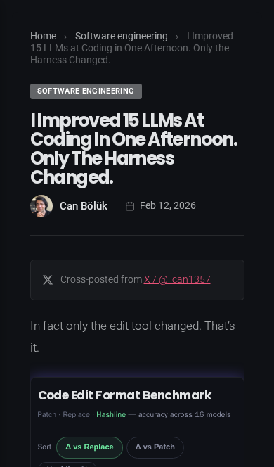 Improving 15 LLMs at Coding in One Afternoon. Only the Harness Changed